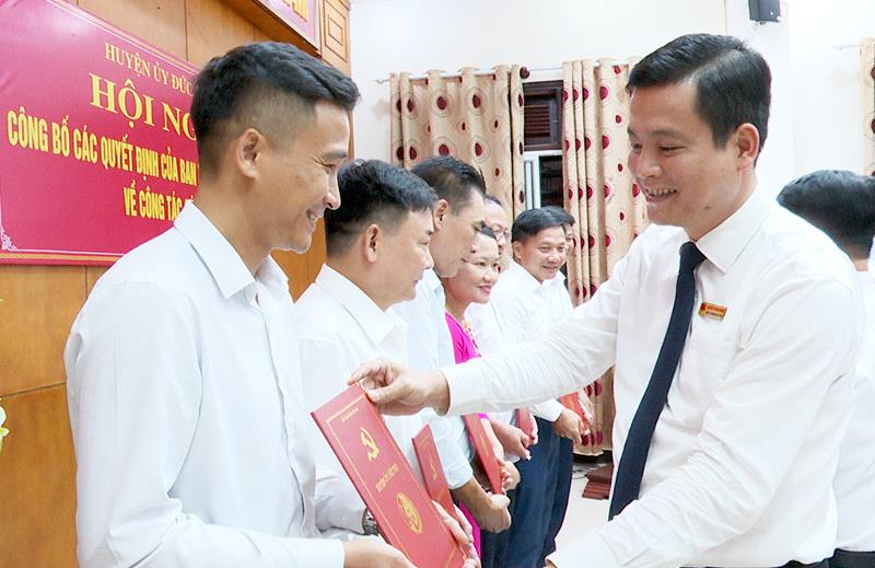 Bí thư Huyện ủy Nguyễn Thành Đồng trao quyết định cho các đồng chí được điều động, luân chuyển, bổ nhiệm