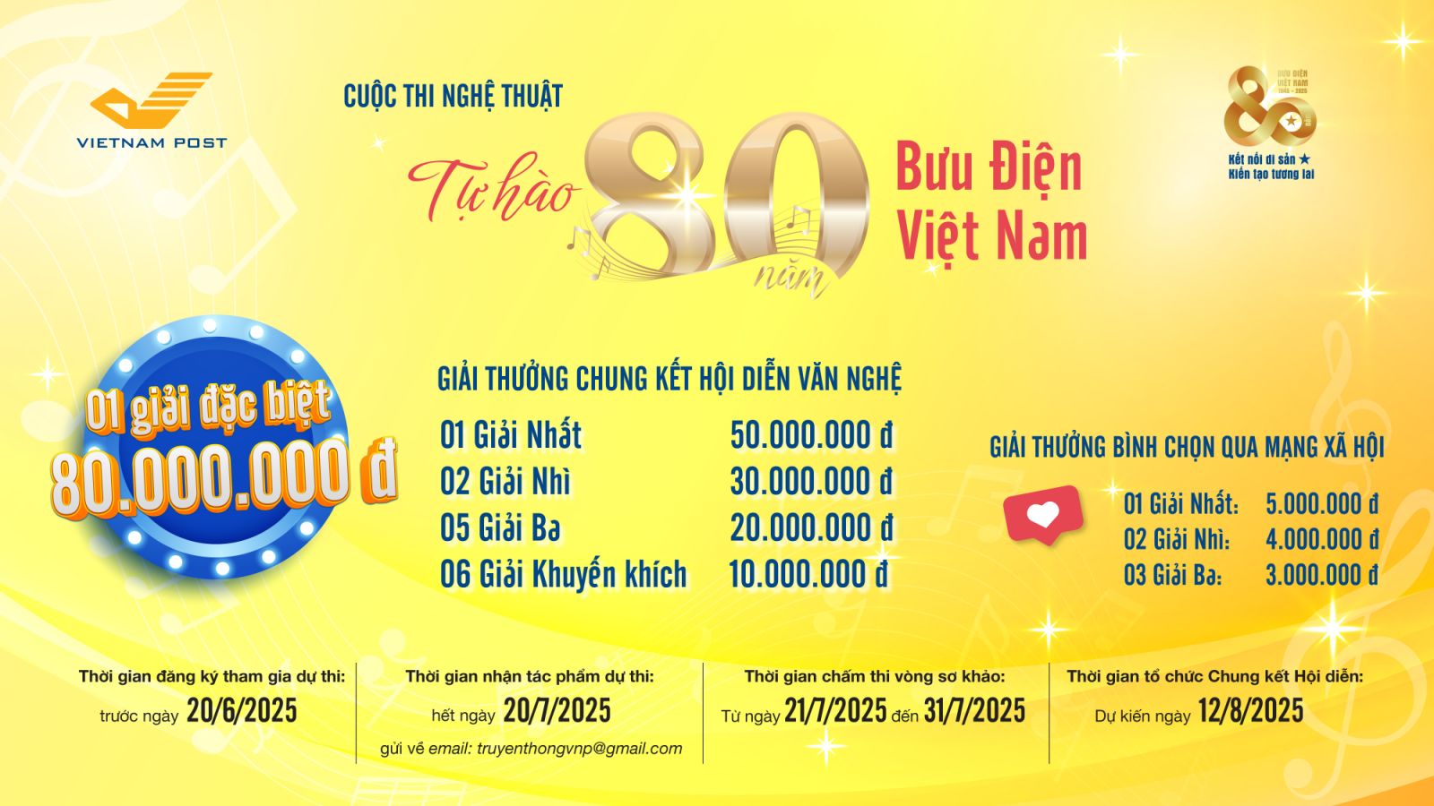 Các tác phẩm xuất sắc sẽ được vinh danh, trao thưởng và lựa chọn trình diễn trong những sự kiện trọng đại của ngành. Cuộc thi hứa hẹn là dấu ấn tinh thần đặc biệt, góp phần lan tỏa hình ảnh đẹp, giàu cảm xúc về một Bưu điện Việt Nam vững vàng trong trái tim nhân dân.