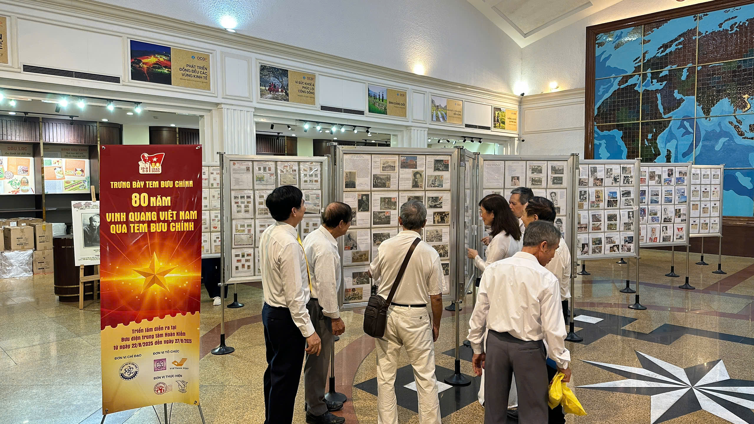 Khách tham quan chăm chú ngắm nhìn những bộ tem bưu chính tái hiện hành trình 80 năm lịch sử dân tộc, được trưng bày trang trọng tại Bưu điện Hà Nội.