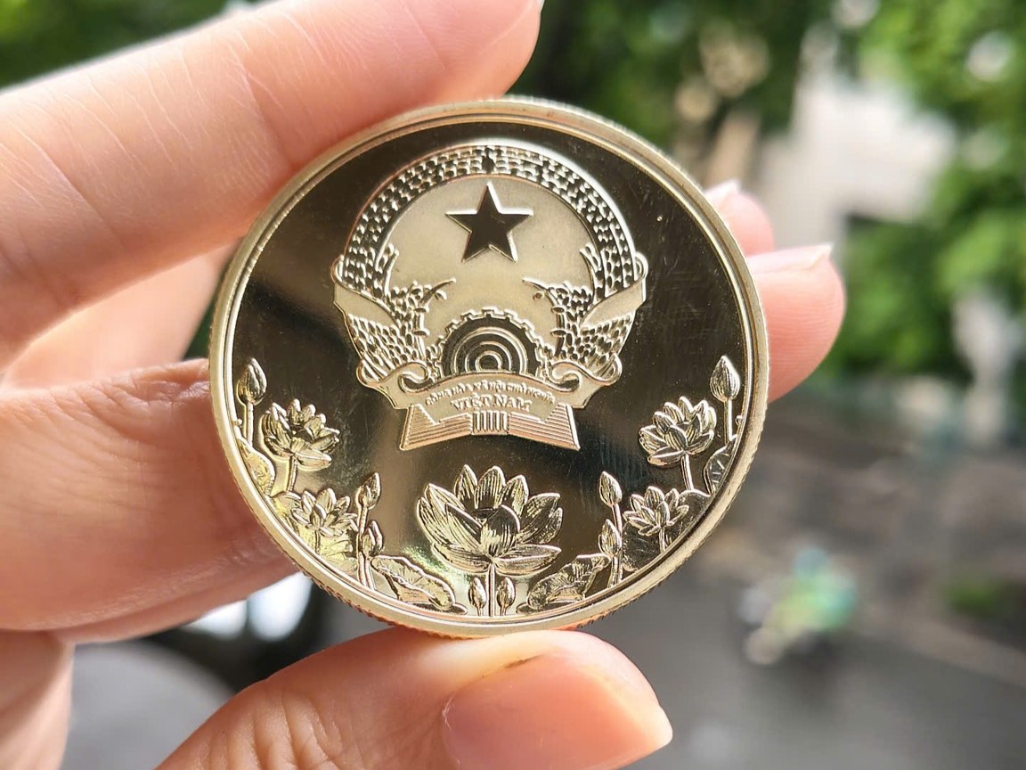 Mặt sau đồng xu in nổi Quốc huy và hoa sen – biểu tượng trường tồn của Việt Nam (Ảnh: Công ty Tem Bưu chính)