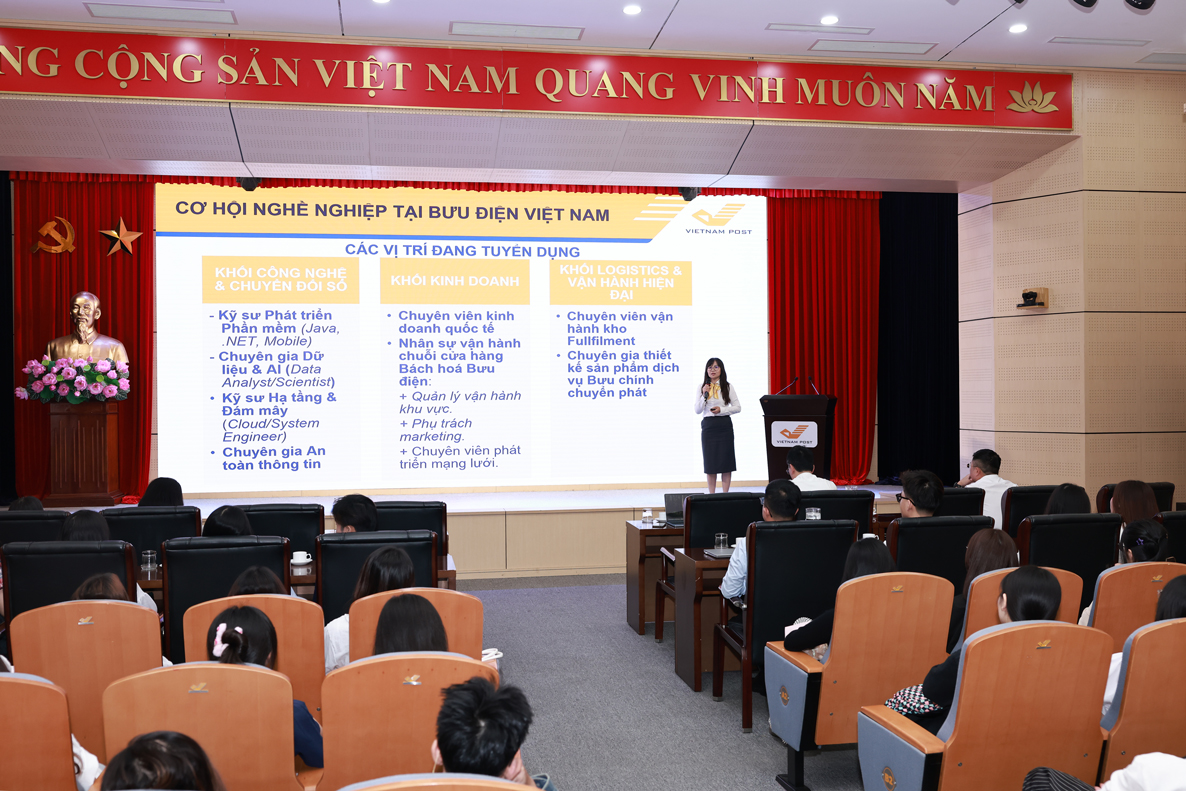 Trong buổi giao lưu, định hướng nghề nghiệp, đại diện Tổng công ty Bưu điện Việt Nam đã chia sẻ về cơ hội việc làm, môi trường làm việc và những kỹ năng cần thiết để sinh viên tự tin hòa nhập sau khi tốt nghiệp. Nhiều câu hỏi được trao đổi sôi nổi, thể hiện sự quan tâm của sinh viên đến lĩnh vực bưu chính, logistics và chuyển đổi số.