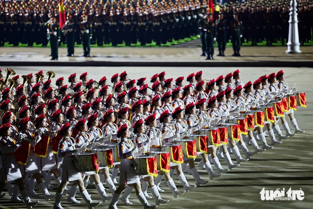 Khối nữ quân nhạc rạng ngời với quân phục màu trắng, mũ nồi đỏ - Ảnh: NGUYỄN KHÁNH
