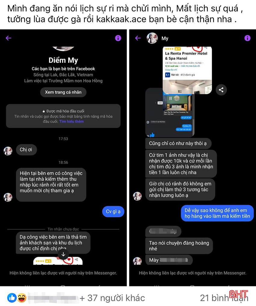 Mới đây, chị H.T.H. ở Cẩm Xuyên cũng bị một người lạ mặt “ngỏ lời” làm thêm tại nhà, công việc nhẹ nhàng, chỉ việc thả tim vào ảnh khách sạn và khu du lịch được chỉ định. Đáng nói, cứ thả tim một ảnh là sẽ nhận được 10 nghìn đồng tiền công. Nhận thấy thủ đoạn lừa đảo, chị H. đã từ chối và ngay lập tức nhận được những tin nhắn xúc phạm của những kẻ lừa đảo.