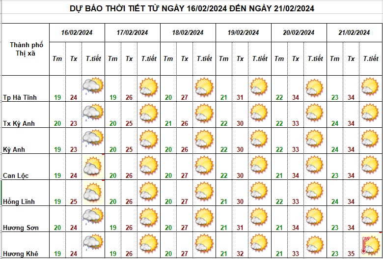 Theo Trung tâm khí tượng Thủy văn Hà Tĩnh, thời tiết trong những ngày tới: Ngày 16/02 do ảnh hưởng của KKL tăng cường yếu nên có mưa nhỏ vài nơi, trưa chiều có lúc