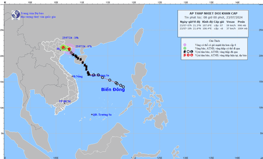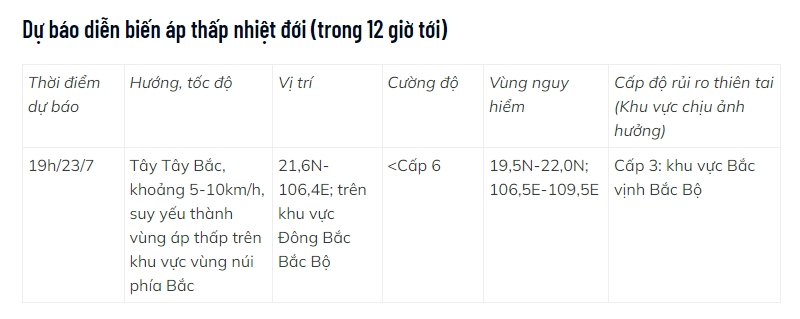 Hồi 7 giờ, vị trí tâm áp thấp nhiệt đới ở vào khoảng 21,3 độ Vĩ Bắc, 107,6 độ Kinh Đông, trên vùng ven biển Quảng Ninh - Hải Phòng; sức gió mạnh nhất vùng gần tâm áp thấp nhiệt đới mạnh cấp 7 (50-61km/h), giật cấp 9, di chuyển chậm theo hướng Tây Tây Bắc với tốc độ 5-10km/h.