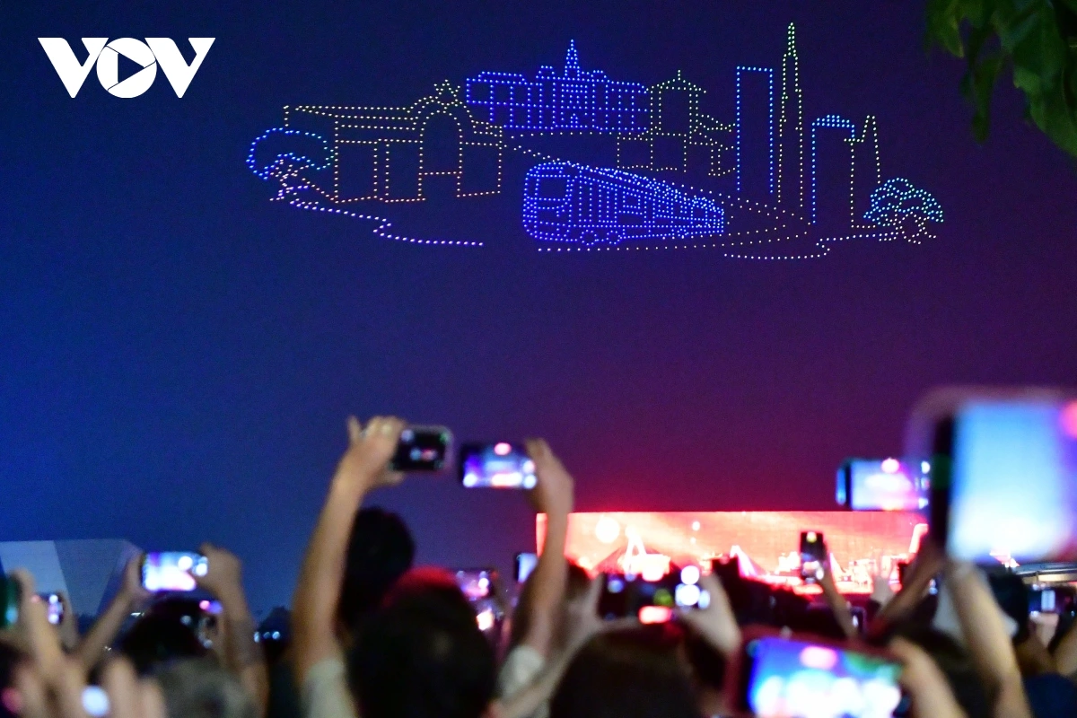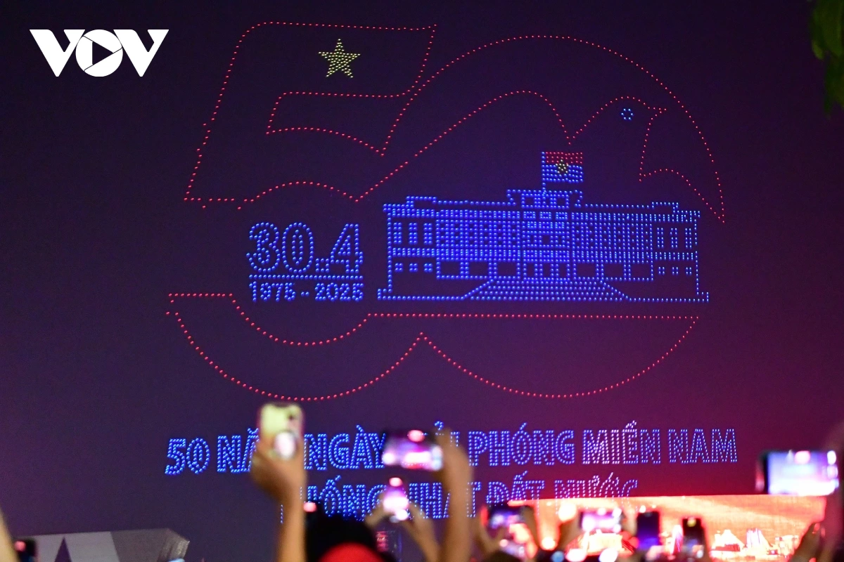 Trong buổi tổng duyệt kéo dài 15 phút, các drone bay trên cao và xếp thành những hình ảnh mang biểu tượng thể hiện quá trình phát triển của TP.HCM và chào mừng 50 năm thống nhất đất nước.