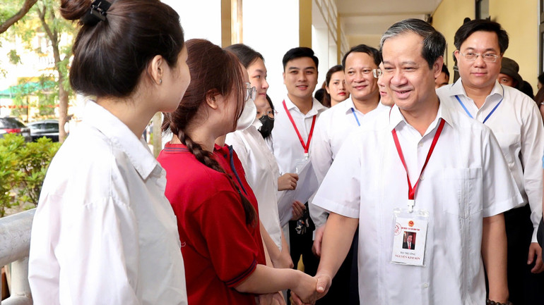 Bộ trưởng Giáo dục và Đào tạo Nguyễn Kim Sơn động viên thí sinh tại một điểm thi trong Kỳ thi tốt nghiệp THPT năm 2025.