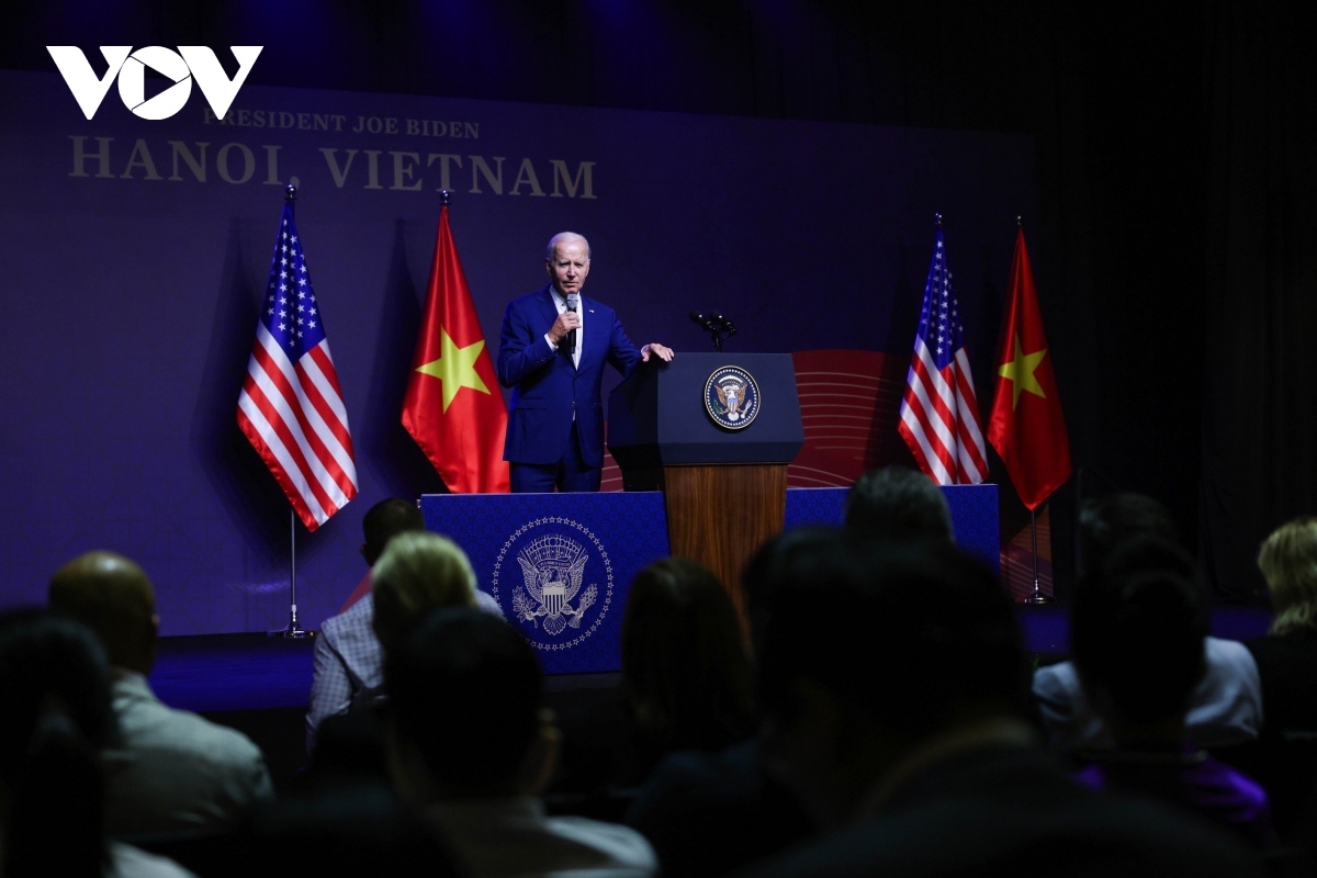 Họp báo tối 10/9 tại khách sạn Marriott, Hà Nội, Tổng thống Biden đã cảm ơn sự đón tiếp của Việt Nam và nhấn mạnh chuyến thăm cấp Nhà nước của ông mang tính lịch sử.
