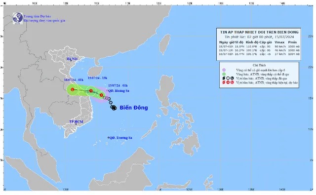 Theo Trung tâm Dự báo khí tượng thủy văn Quốc gia, hồi 1h ngày 15/7, vị trí tâm áp thấp nhiệt đới ở vào khoảng 15,5 độ Vĩ Bắc; 110,8 độ Kinh Đông, trên vùng biể