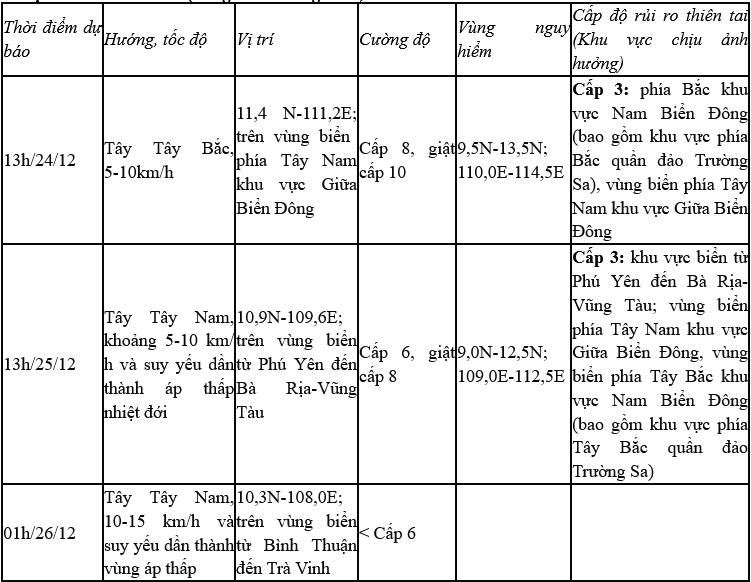 Hồi 13 giờ, vị trí tâm bão ở vào khoảng 11,2 độ Vĩ Bắc; 112,4 độ Kinh Đông, trên khu vực phía Tây Bắc quần đảo Trường Sa. Sức gió mạnh nhất vùng gần tâm bão mạnh cấp 8 (62-74km/h), giật cấp 10; di chuyển theo hướng Tây Tây Bắc, tốc độ khoảng 10km/h.