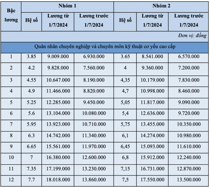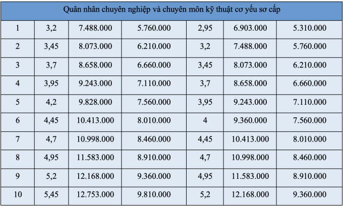 Bảng lương quân nhân chuyên nghiệp và chuyên môn kỹ thuật cơ yếu: