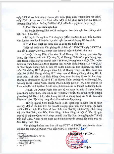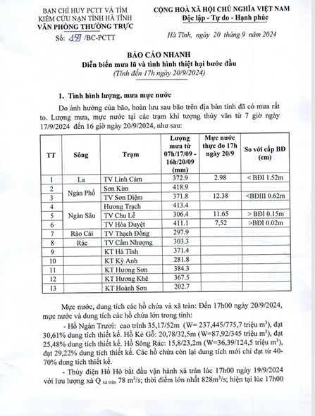 Báo cáo nhanh về diễn biến mưa lũ và tình hình thiệt hại bước đầu trên địa bàn tỉnh Hà Tĩnh