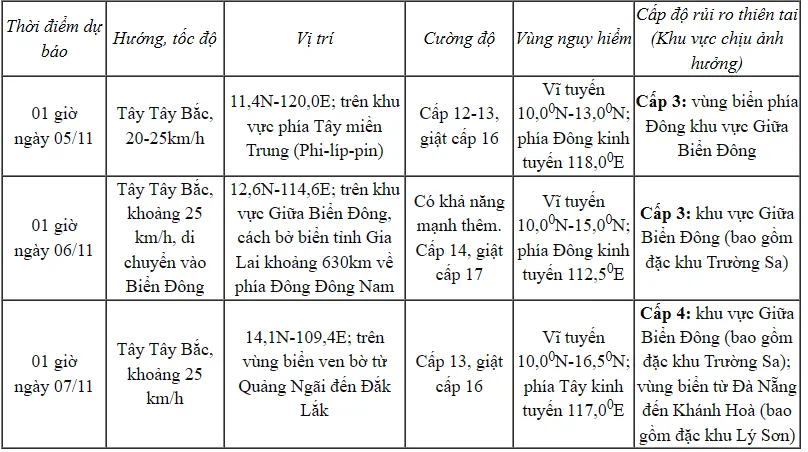 Cảnh báo khoảng ngày 5-6/11, khu vực giữa Biển Đông (bao gồm đặc khu Trường Sa), vùng biển ngoài khơi khu vực Đà Nẵng - Khánh Hòa có khả năng chịu tác động của gió mạnh cấp 12-14, giật trên cấp 17, sóng biển cao 8-10m, biển động dữ dội.