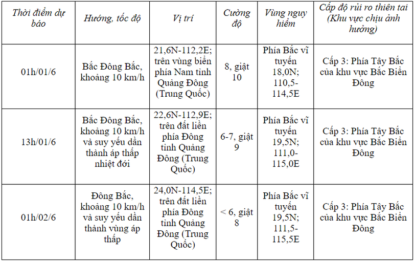 Hồi 13 giờ, vị trí tâm bão ở vào khoảng 20,7 độ Vĩ Bắc; 111,8 độ Kinh Đông, trên vùng biển phía Nam tỉnh Quảng Đông (Trung Quốc). Sức gió mạnh nhất vùng gần tâm bão mạnh cấp 8 (62-74km/h), giật cấp 10; di chuyển theo hướng Bắc với tốc độ khoảng 15-20km/h.