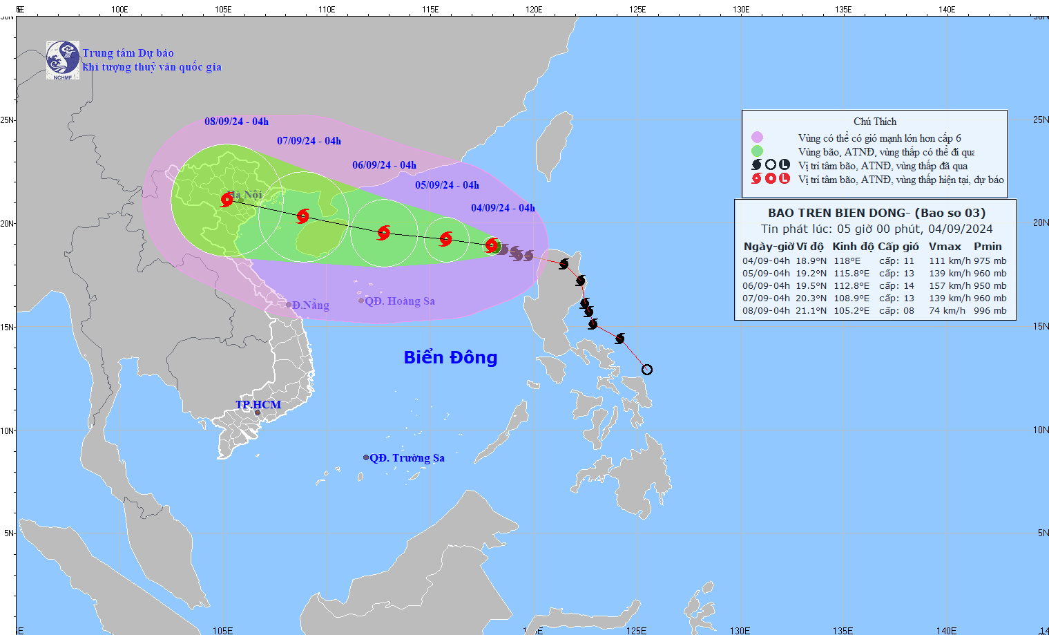 Từ ngày 5-6/9, bão số 3 có thể đạt cấp bão rất mạnh trên vùng biển phía Bắc của khu vực Bắc Biển Đông, gió mạnh có thể lên tới cấp 14, giật cấp 17 ở vùng gần tâm bão.