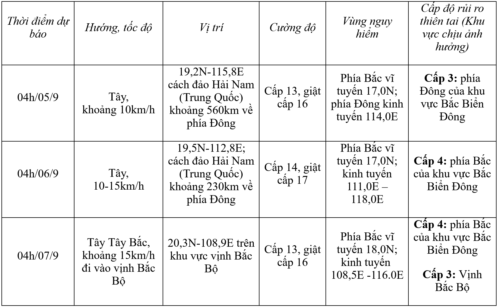 Hồi 4 giờ ngày 4/9, vị trí tâm bão ở vào khoảng 18,9 độ Vĩ Bắc; 118,0 độ Kinh Đông, trên vùng biển phía Đông khu vực Bắc Biển Đông. Sức gió mạnh nhất vùng gần tâm bão mạnh cấp 11 (103-117km/h), giật cấp 13, di chuyển theo hướng Tây Tây Bắc, khoảng 10km/h.