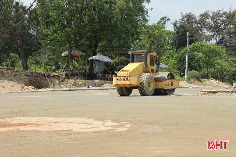 Đơn vị thi công lu nền tuyến đường vào khu du lịch Xuân Thành để tiến hành thảm nhựa trước dịp lễ khai trương.