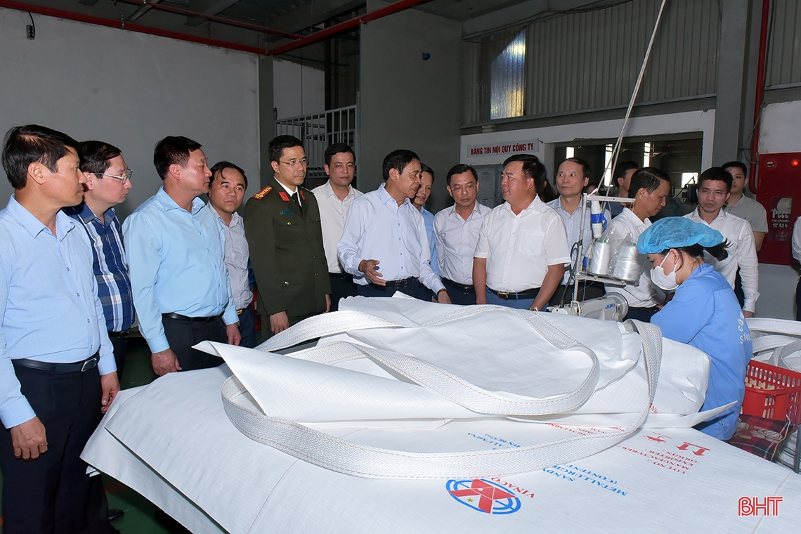 Chủ tịch UBND tỉnh Võ Trọng Hải và đoàn kiểm tra sản xuất tại Công ty cổ phần bao bì Sông La Xanh.