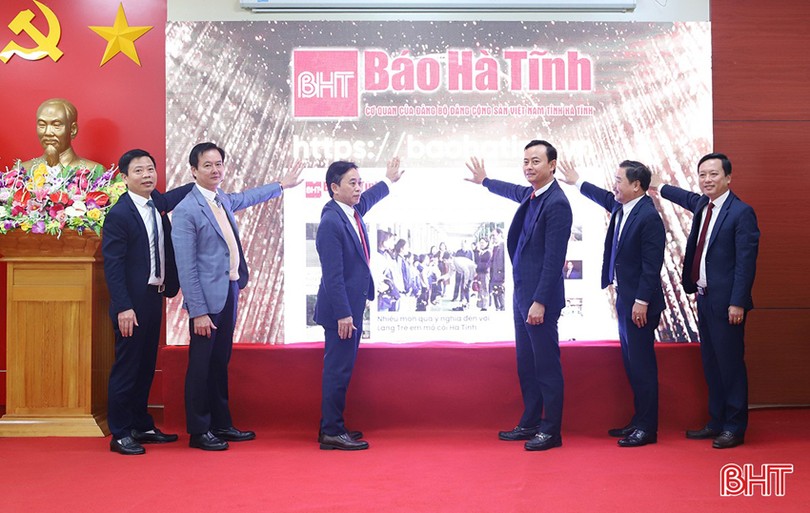 Phó Bí thư Thường trực Tỉnh ủy Trần Thế Dũng cùng các đồng chí lãnh đạo ban, ngành ấn nút ra mắt giao diện mới của Báo Hà Tĩnh điện tử vào tháng 4/2024.