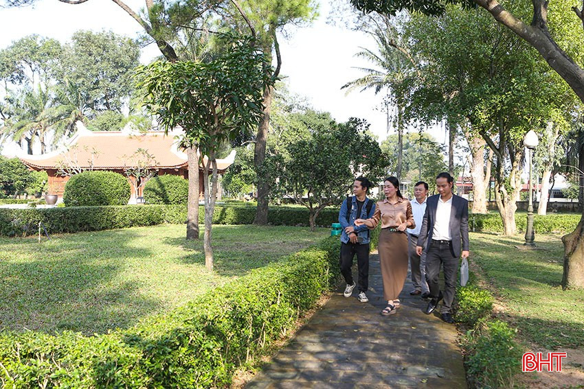 Cán bộ Ban Quản lý Khu di tích Nguyễn Du (Nghi Xuân) tham khảo chuyên gia thiết kế tạo điểm nhấn điểm check in phục vụ du khách dịp xuân Ất Tỵ 2025.