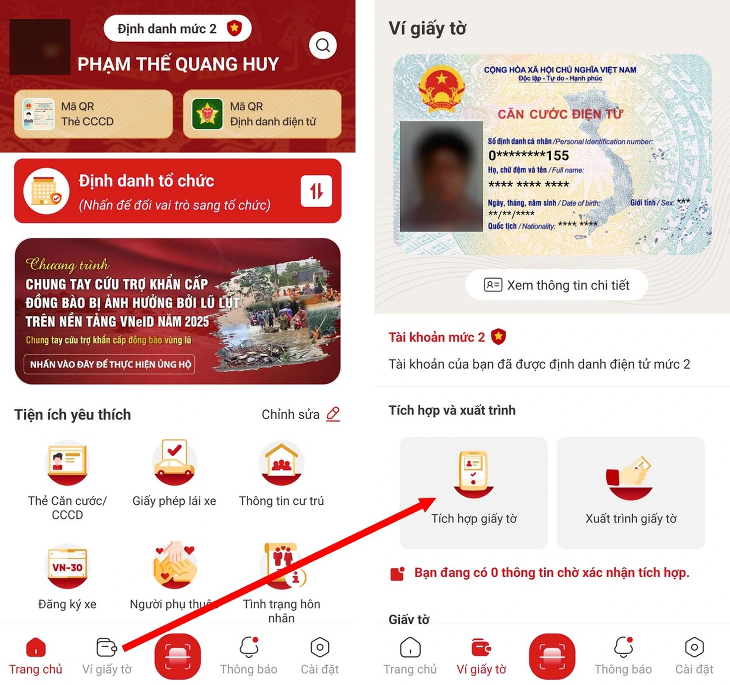 - Từ giao diện của ứng dụng VNeID, nhấn chọn “Ví giấy tờ” ở menu bên dưới, sau đó chọn “Tích hợp giấy tờ” tại giao diện hiện ra.