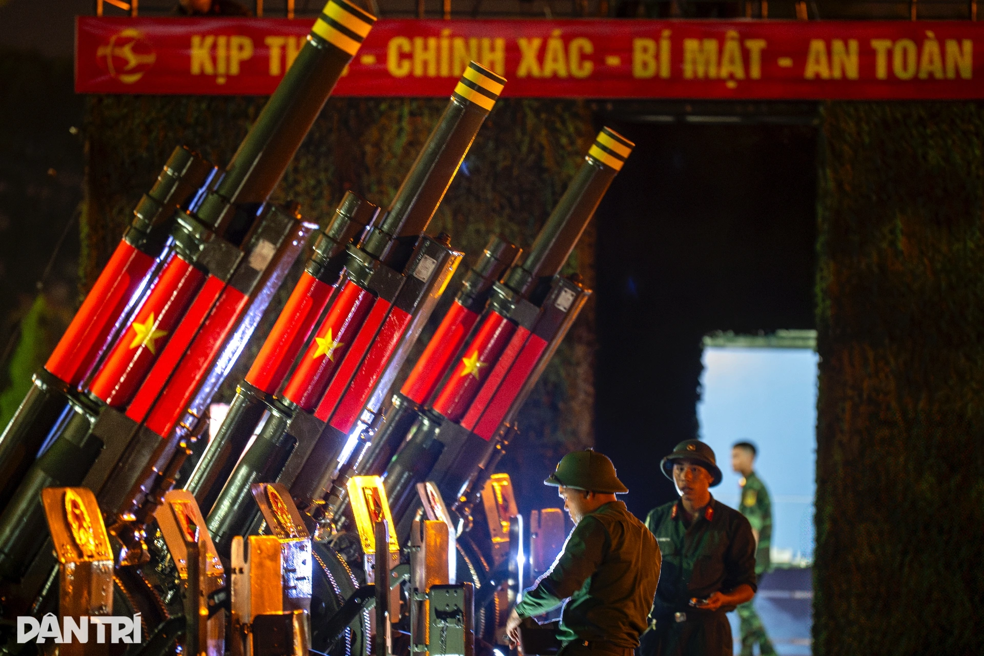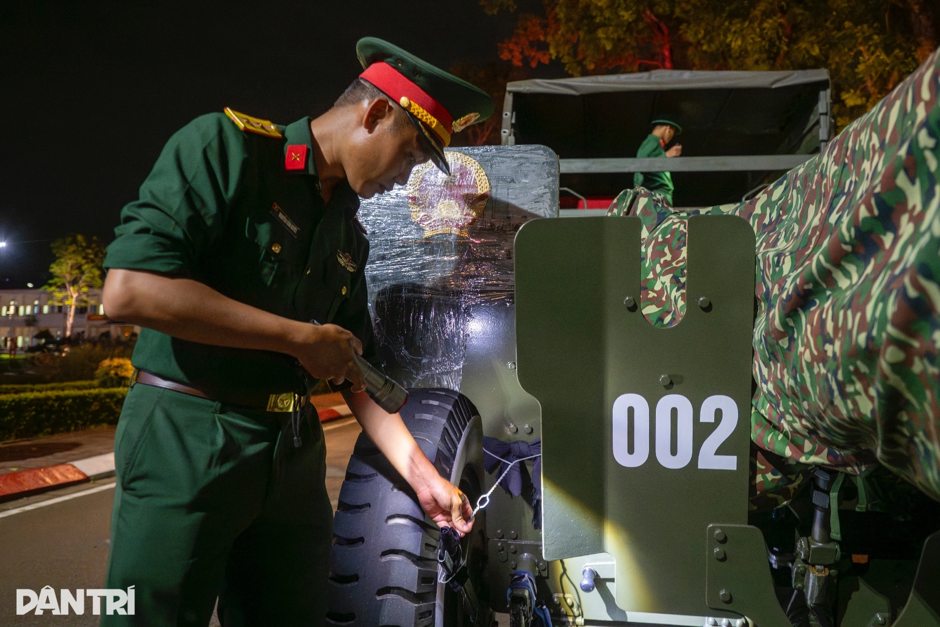 Chiến sĩ Nguyễn Văn Quyết (Pháo thủ số 2, Khẩu đội 2, Trung đội 1, Đội pháo lễ) tỉ mỉ kiểm tra lại từng chi tiết chằng buộc trước giờ hành quân. Đặc biệt, ở mỗi khu vực nòng pháo đều được gắn thêm một chiếc đèn pin chiếu sáng, vừa như tín hiệu dẫn đường, vừa đóng vai trò như đèn báo hiệu giúp các xe phía sau quan sát rõ ràng.