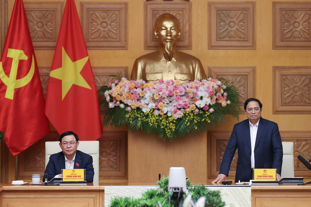 Đồng chí Phạm Minh Chính, Ủy viên Bộ Chính trị, Bí thư Ban Cán sự Đảng Chính phủ, Thủ tướng Chính phủ và đồng chí Vương Đình Huệ, Ủy viên Bộ Chính trị, Bí thư Đảng đoàn Quốc hội, Chủ tịch Quốc hội đồng chủ trì cuộc họp.