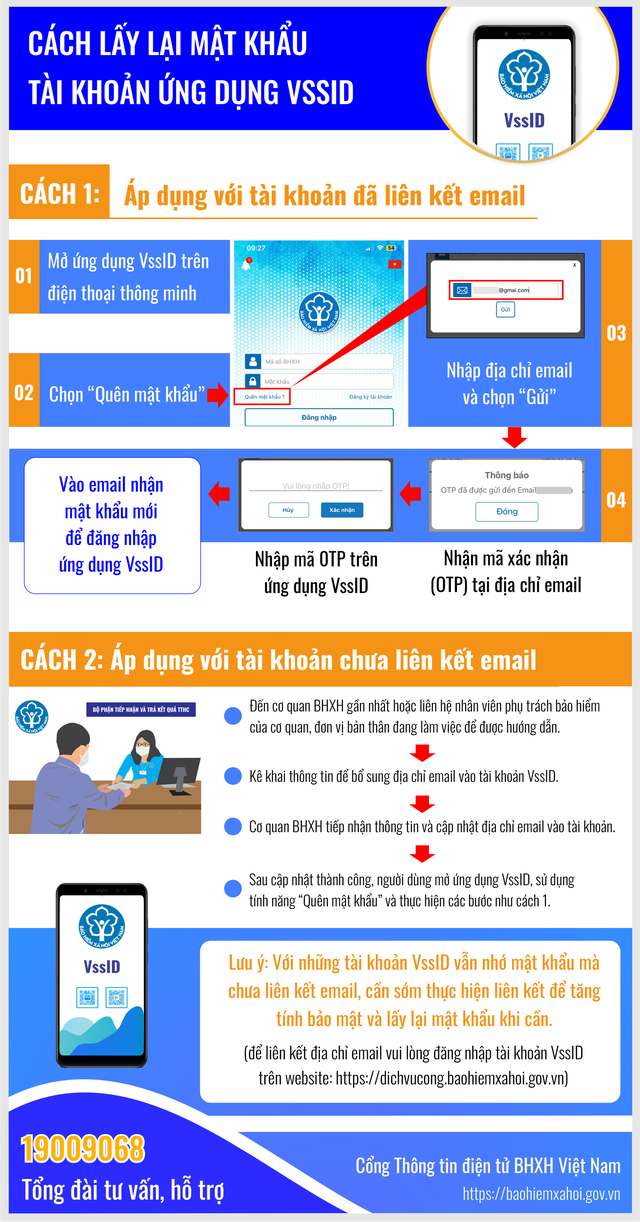 Việc cấp lại mật khẩu tài khoản giao dịch BHXH điện tử qua chức năng "Quên mật khẩu" trên ứng dụng VssID hoặc Cổng DVC BHXH Việt Nam (mật khẩu sẽ được cung cấp qua địa chỉ email mà người dân kê khai khi đăng ký tài khoản giao dịch BHXH điện tử). Trường hợp khi đăng ký tài khoản VssID nhưng chưa có thông tin về địa chỉ email, người dân có thể bổ sung địa chỉ email qua các kênh sau: Thực hiện việc lập Tờ khai TK1-TS để kê khai bổ sung thông tin email thông qua giao dịch BHXH điện tử của đơn vị, tổ chức dịch vụ thu đang quản lý hoặc thực hiện lập tờ khai thay đổi, bổ sung thông tin đăng ký sử dụng phương thức giao dịch điện tử trong lĩnh vực BHXH theo Mẫu số 02/SĐ-GD, đến nộp trực tiếp tại cơ quan BHXH nơi gần nhất hoặc liên hệ trực tiếp tới Trung tâm Dịch vụ hỗ trợ, chăm sóc khách hàng qua số hotline 1900.9068 hoặc số 0243.7899999 (trong giờ hành chính) để được hỗ trợ.