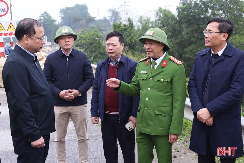Đại tá Đặng Hoài Sơn - Phó Giám đốc Công an tỉnh, Phó trưởng Ban ATGT tỉnh (thứ 2 từ phải qua) trong chuyến kiểm tra công tác đảm bảo ATGT trên quốc lộ 8.
