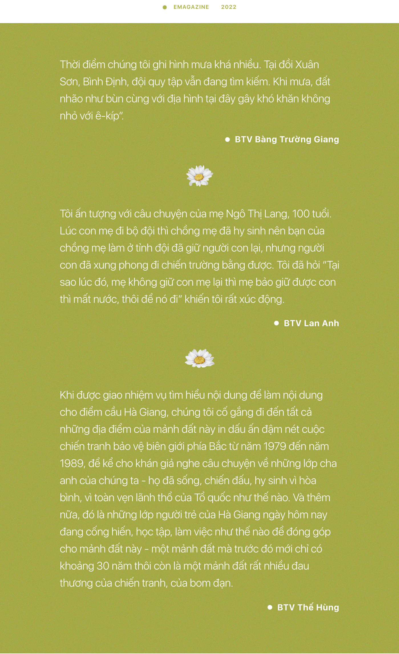"Nói đến Quảng Nam, người ta nhớ tới câu ‘Dốc Quảng Nam, gan Cộng sản’ – mảnh đất mà mới nói đến tên thôi là đã thấy sự kiên cường của người Quảng hay những người con đã dừng chân ở đất Quảng Nam như thế nào" - BTV Thu Yến chia sẻ - "Còn Bình Định với vị trí đặc biệt là điểm cuối cùng trước khi tập kết vào chiến trường miền Nam, thế nên ở mảnh đất Bình Định, chúng tôi sử dụng từ ‘biệt ly’. Bình Định là mảnh đất năm xưa Bác Hồ đã biệt ly cha của mình để ra đi tìm đường cứu nước. Đây cũng là mảnh đất những người con chào tạm biệt gia đình và gần như trở thành lời biệt ly rất khó để gặp lại nhau sau chiến tranh. Những vùng đất có nhiều dấu tích chiến tranh như vậy sẽ kể rất nhiều câu chuyện cảm xúc".