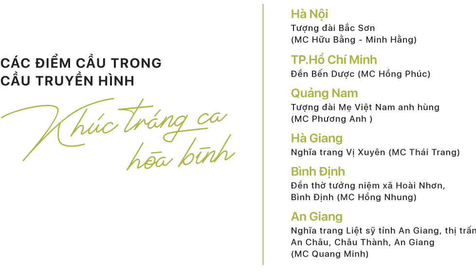 Người dẫn chương trình tại các điểm cầu đều là những gương mặt MC - BTV có kinh nghiệm dẫn nhiều chương trình truyền hình trực tiếp, đặc biệt là cầu truyền hình lớn. Được trao nhiệm vụ dẫn dắt ở các điểm cầu lần này, mỗi người đều cảm thấy vinh dự và tự hào khi được đóng góp phần nhỏ của mình vào cầu truyền hình lớn và ý nghĩa nhân dịp kỷ niệm 75 năm Ngày Thương binh - Liệt sỹ.