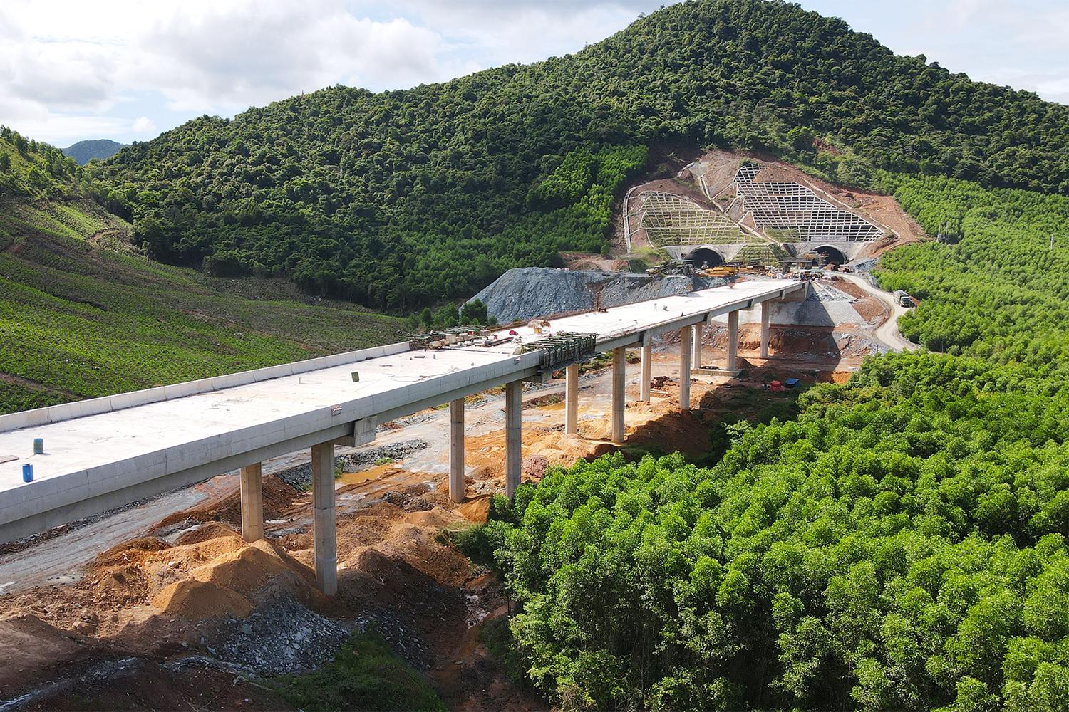 Sau gần 19 tháng kể từ ngày khởi công, tuyến cao tốc Vũng Áng - Bùng đã dần hình thành với tuyến chính được thi công cấp phối đá dăm gia cố xi măng và thảm lớp bê tông nhựa rỗng C25 cùng nhiều hạng mục hầm xuyên núi và cầu băng rừng, vượt sông.