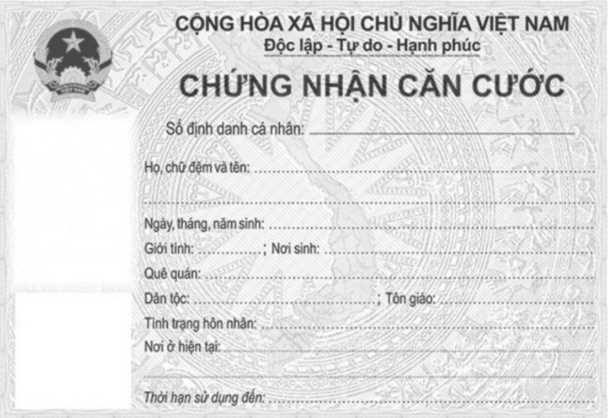 Hình Quốc huy nước Cộng hòa xã hội chủ nghĩa Việt Nam và ảnh khuôn mặt của người được cấp giấy chứng nhận căn cước được in màu trực tiếp trên giấy chứng nhận căn cước. Hình Quốc huy nước Cộng hòa xã hội chủ nghĩa Việt Nam đường kính 13mm; ảnh khuôn mặt của người được cấp giấy chứng nhận căn cước kích thước 20mm x 30mm; vị trí in mã QR kích thước 18mm x 18mm; vị trí in vân tay ngón trỏ trái kích thước 22mm x 25mm; vị trí in vân tay ngón trỏ phải kích thước 22mm x 25mm.