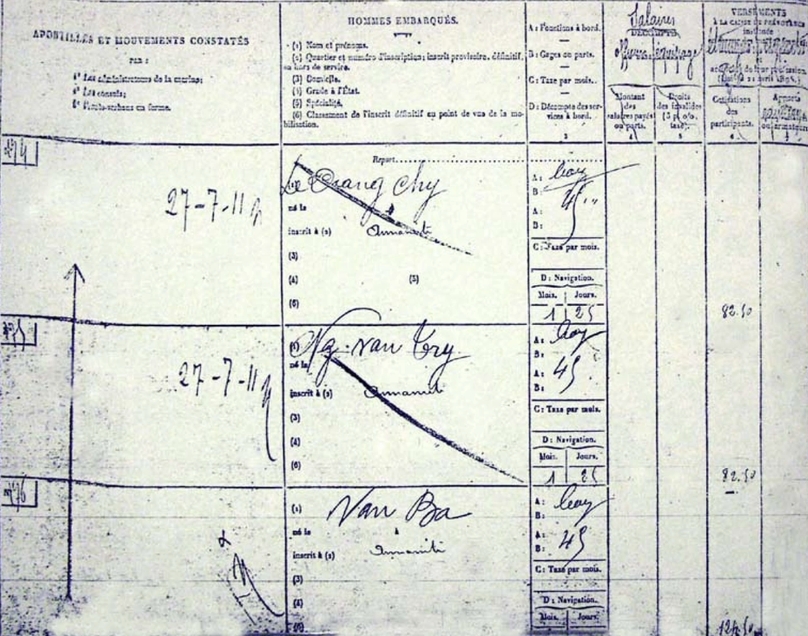 Trang sổ lương của các thủy thủ tàu Amiral Latouche Tréville năm 1911, thủy thủ mang tên Văn Ba là Chủ tịch Hồ Chí Minh sau này