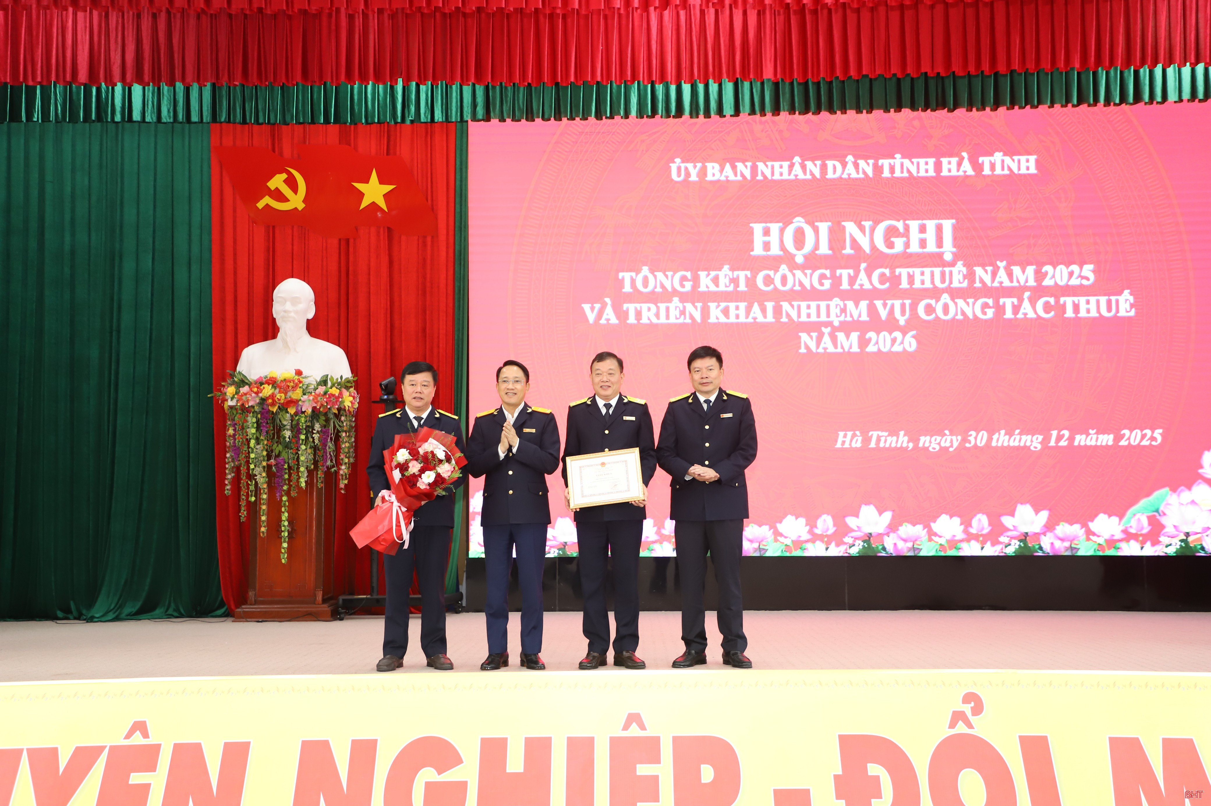 Phó Cục trưởng Cục Thuế Mai Sơn trao giấy khen của Cục trưởng Cục Thuế cho Thuế tỉnh Hà Tĩnh đã có thành tích xuất sắc trong công tác thu ngân sách Nhà nước năm 2025
