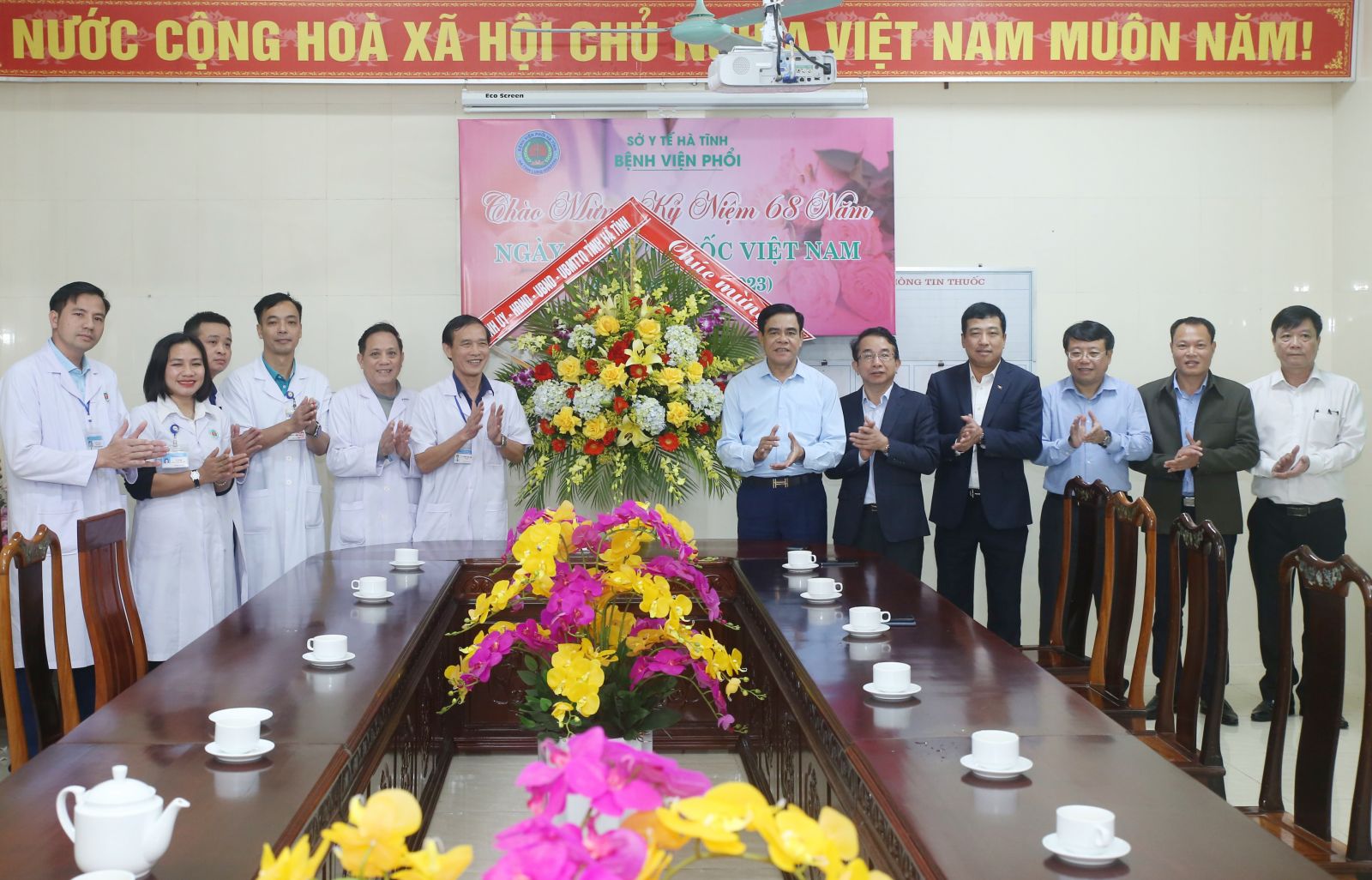 Đoàn tặng hoa chúc mừng Bệnh viện Phổi Hà Tĩnh.