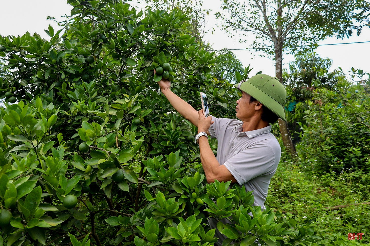 Ông Đinh Văn Nhâm - Giám đốc HTX Cam Khe Mây Long Nhâm (Hương Khê) sử dụng điện thoại theo dõi quá trình sinh trưởng, phát triển của cây cam.