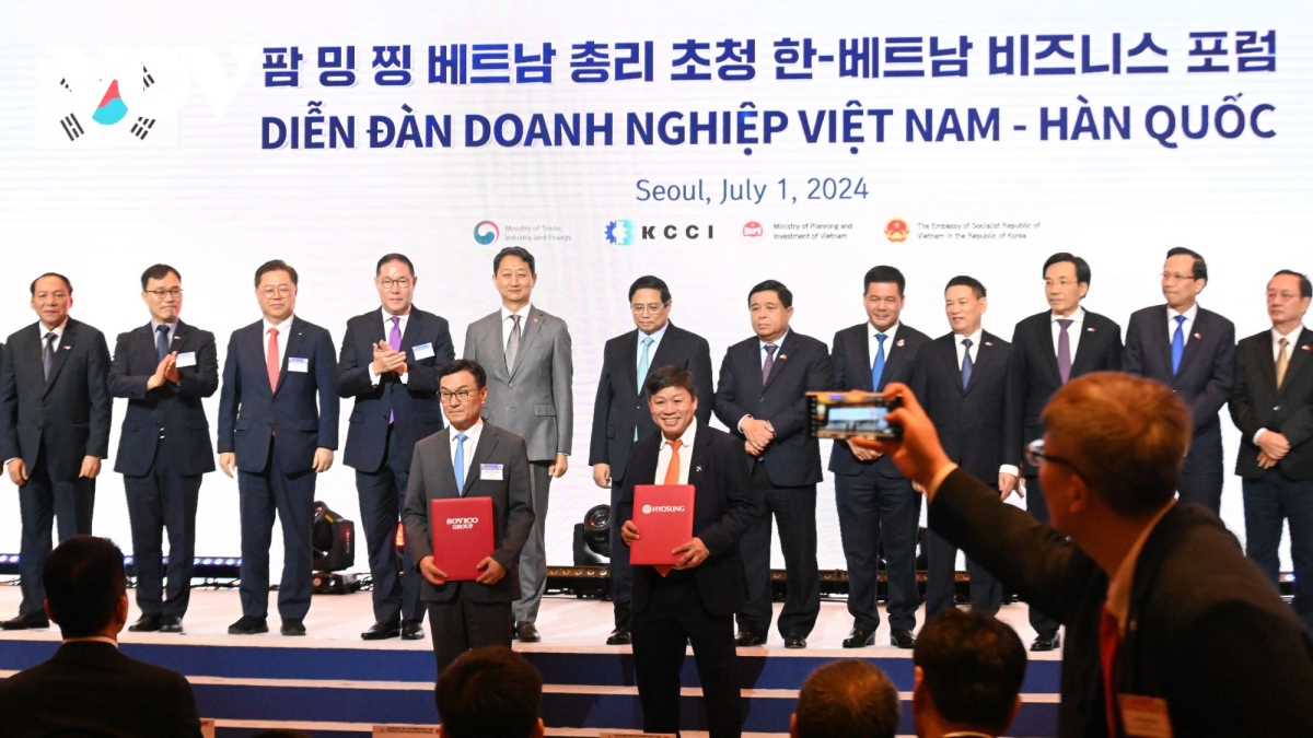 Tại Diễn đàn doanh nghiệp Việt Nam - Hàn Quốc và Tọa đàm với các tổ chức kinh tế hàng đầu Hàn Quốc về năng lượng và tài chính, Thủ tướng Phạm Minh Chính đã chia sẻ tình hình và định hướng phát triển kinh tế Việt Nam, đề nghị các doanh nghiệp Hàn Quốc tiếp tục mở rộng đầu tư vào Việt Nam, đồng thời chứng kiến lễ ký 23 văn kiện hợp tác giữa các doanh nghiệp và địa phương hai nước về hợp tác trong các lĩnh vực thương mại, đầu tư, y tế, giáo dục, bán dẫn, năng lượng và tăng cường hợp tác giữa các địa phương Việt Nam với các doanh nghiệp Hàn Quốc.