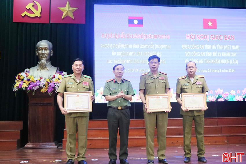 Tại hội nghị, thừa uỷ quyền của Bộ trưởng Bộ Công an Việt Nam và Chủ tịch UBND tỉnh Hà Tĩnh, Đại tá Nguyễn Xuân Thao - Giám đốc Công an tỉnh Hà Tĩnh đã trao bằng khen của Bộ trưởng Bộ Công an Việt Nam và Chủ tịch UBND tỉnh Hà Tĩnh cho các tập thể, cá nhân thuộc công an 2 tỉnh Bolikhămxay và Khăm Muồn (Lào).
