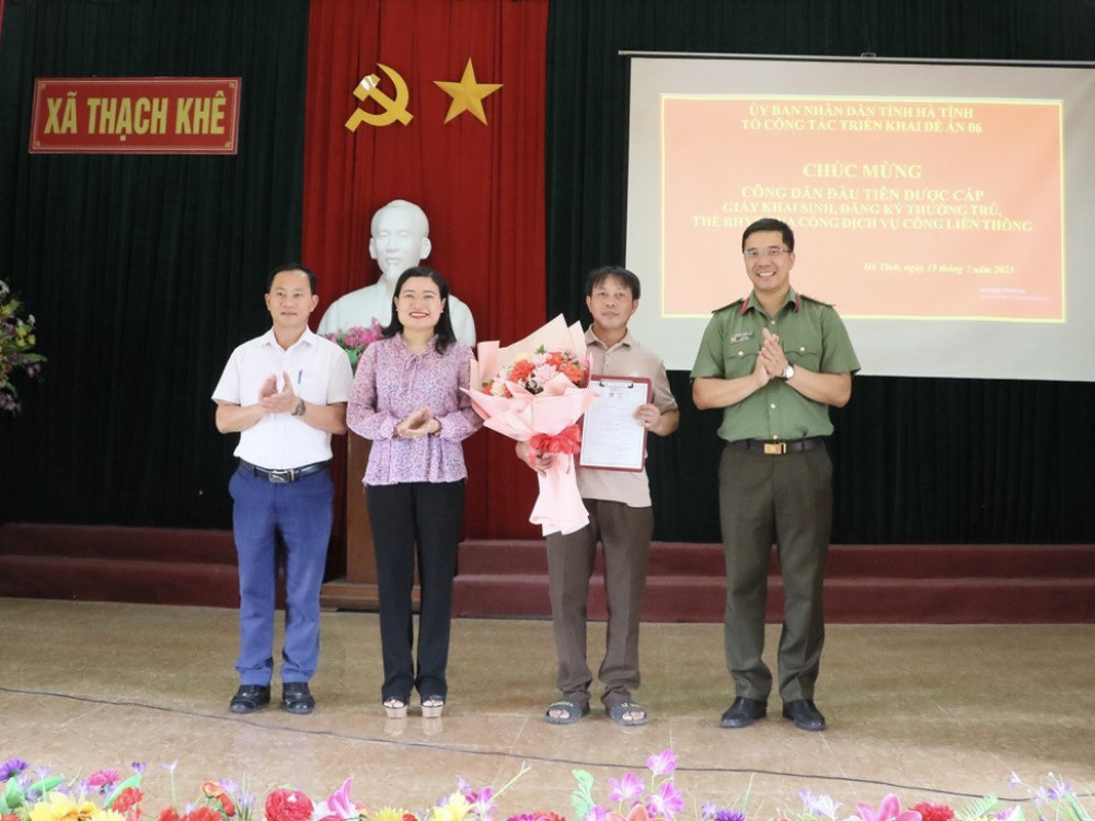Tại buổi lễ, đồng chí Đại tá Nguyễn Hồng Phong, Giám đốc Công an tỉnh cùng lãnh đạo huyện Thạch Hà, đại diện bộ phận Tư pháp, bộ phận Bảo hiểm Y tế huyện đã trao Giấy khai sinh, thẻ BHYT của bé Dương. Văn. Ph trú tại thôn Vĩnh Tiến, xã Thạch Khê, huyện Thạch Hà - trẻ em dưới 6 tuổi và cũng là trường hợp đầu tiên trên địa bàn tỉnh Hà Tĩnh được cấp giấy khai sinh và thẻ BHYT đồng thời với đăng ký thường trú qua dịch vụ công (DVC) liên thông - cho anh Dương Danh Hải (42 tuổi), cha của cháu bé.
