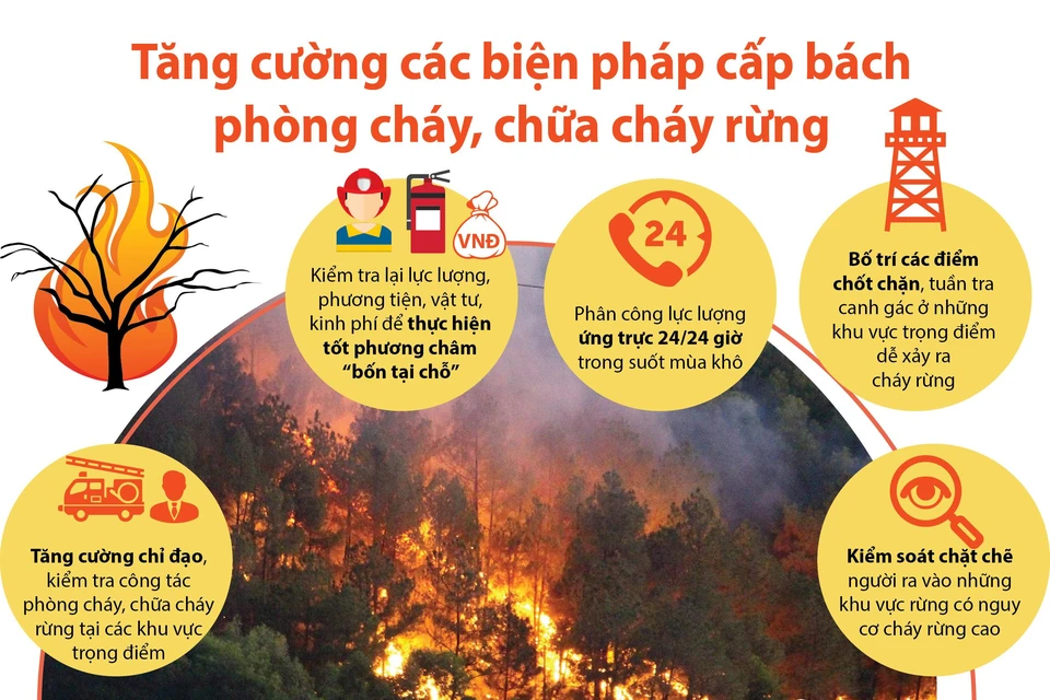 Chỉ đạo các địa phương, đơn vị chủ rừng kiểm tra, rà soát lại phương án, kế hoạch PCCCR đảm bảo sát đúng thực tế, có tính khả thi; chủ động bố trí lực lượng, phương tiện, vật tư, kinh phí để thực hiện tốt phương châm “4 tại chỗ”, quan tâm đảm bảo trang thiết bị bảo hộ lao động, phòng chống khói độc, công tác hậu cần, lương thực, thực phẩm, nước uống, vật tư y tế phục vụ các lực lượng thực hiện nhiệm vụ chữa cháy rừng; phân công lực lượng ứng trực 24/24 giờ tại các điểm trực gác, chốt cửa rừng, điểm trực Camera giám sát để phát hiện sớm lửa rừng, giám sát chặt chẽ người, phương tiện ra, vào các khu vực rừng trọng điểm dễ cháy trong suốt thời gian cao điểm nắng nóng.