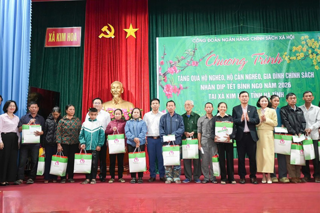 Sáng 21/1, Công đoàn Ngân hàng Chính sách xã hội (CSXH) Việt Nam phối hợp Chi nhánh Ngân hàng CSXH tỉnh tổ chức chương trình tặng quà Tết Nguyên đán Bính Ngọ năm 2026 cho người dân xã Vũ Quang và xã Kim Hoa.
