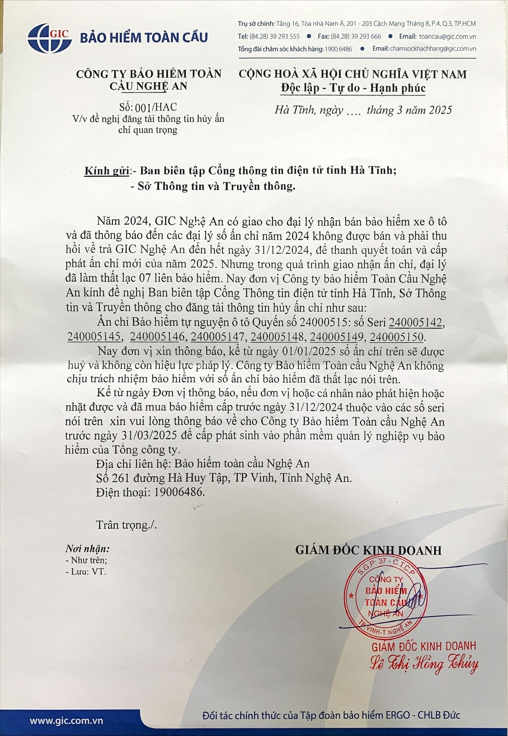 Nay đơn vị xin thông báo, kể từ ngày 01/01/2025 số ấn chỉ trên sẽ được hủy và không còn hiệu lực pháp lý, Công ty bảo hiểm Toàn Cầu Nghệ An không chịu trách nhiệm bảo hiểm với số ấn chỉ bảo hiểm đã thất lạc nói trên.