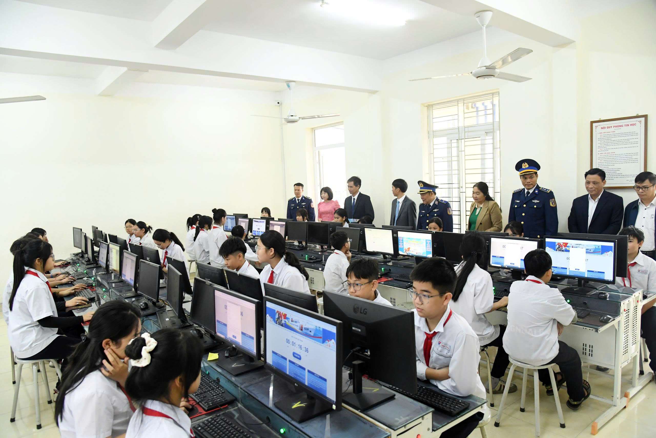 Lãnh đạo BTL Vùng Cảnh sát biển 1 thăm quan phòng thi trực tuyến tại trường THCS Đông Hải