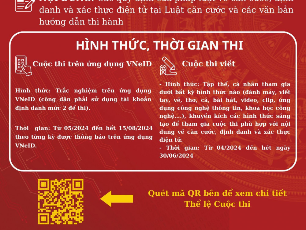 - Hình thức: Tập thể, cá nhân tham gia dưới bất kỳ hình thức nào (đánh máy, viết tay, vẽ, thơ, cá, bài hát, video, clip, ứng dụng công nghệ thông tin, khoa học công nghệ….), khuyến kích các hình thức sáng tạo để tham gia cuộc thi phù hợp với nội dung về căn cước, định danh và xác thực điện tử.