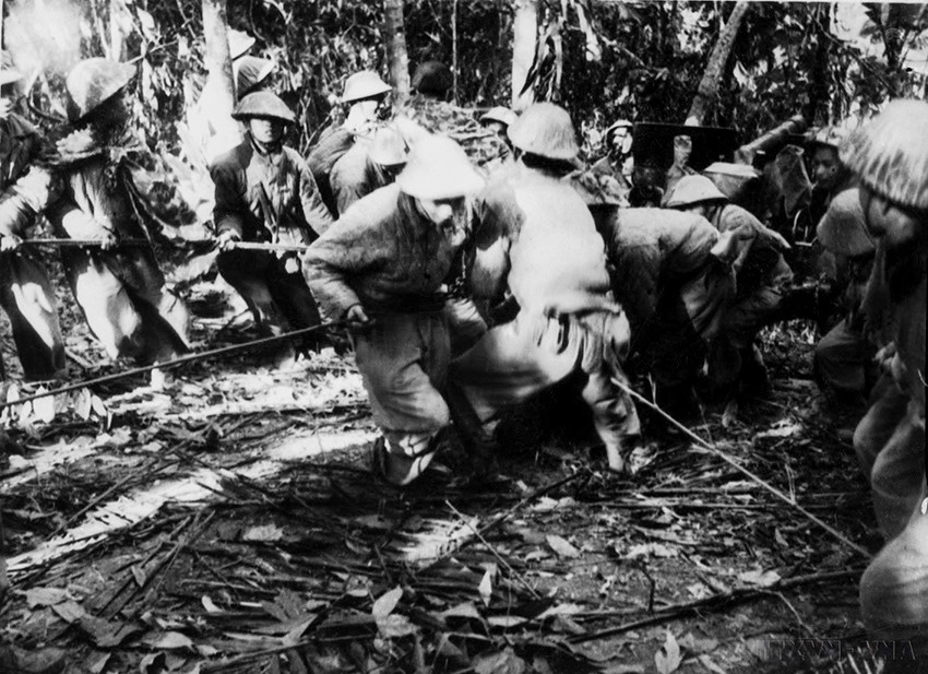 Bộ đội ta kéo pháo vào trận địa trong chiến dịch Điện Biên Phủ. Ảnh: Tư liệu