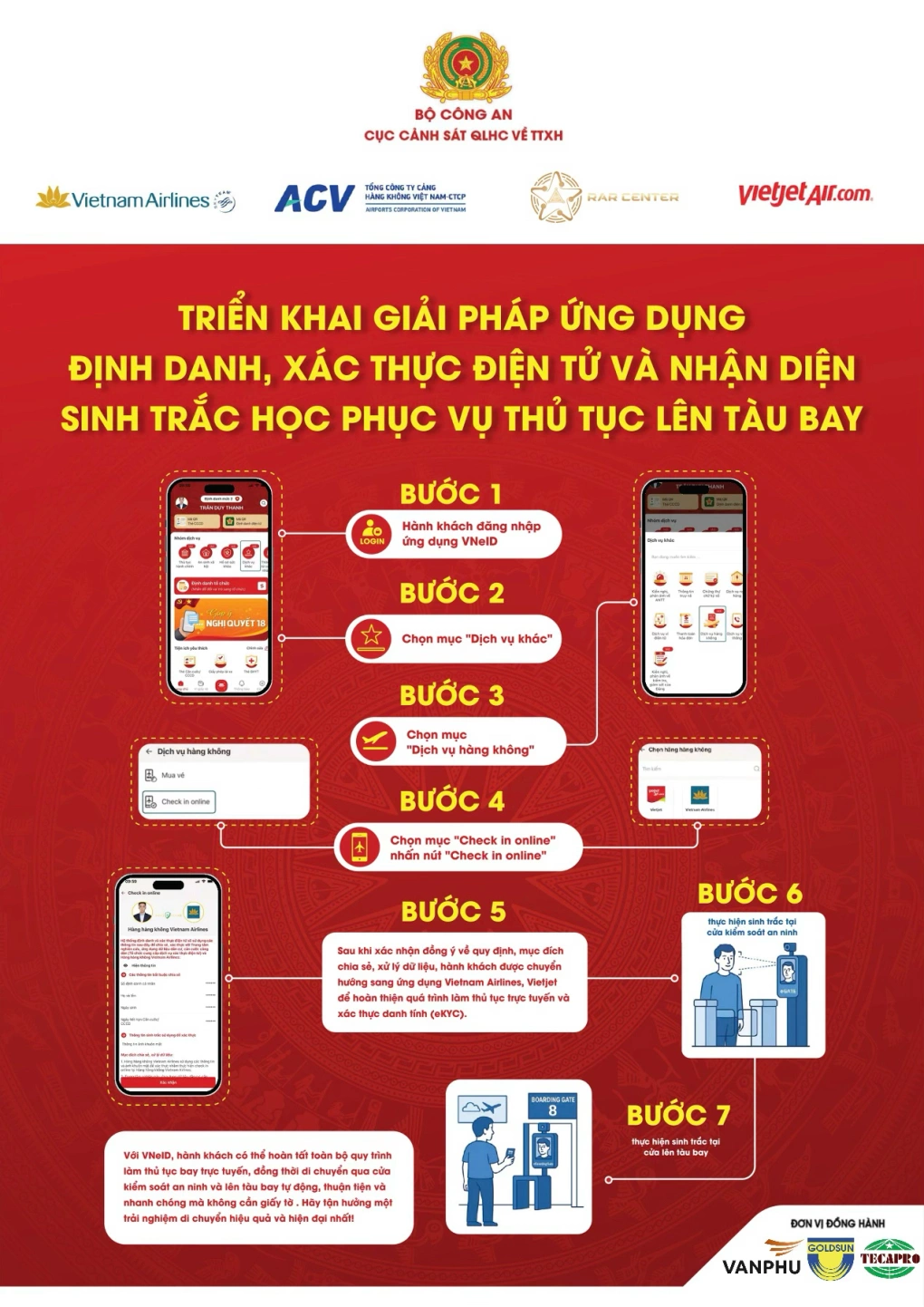 Các bước thực hiện định danh, xác thực điện tử và nhận diện sinh trắc học phục vụ thủ tục lên tàu bay. Ảnh: C06