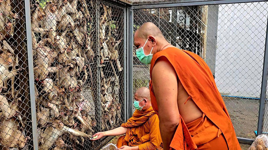 Các nhà sư cho khỉ ăn tại khu vực nuôi nhốt chúng ở thành phố Lopburi, miền trung Thái Lan ngày 17/11. Ảnh: Khaosod