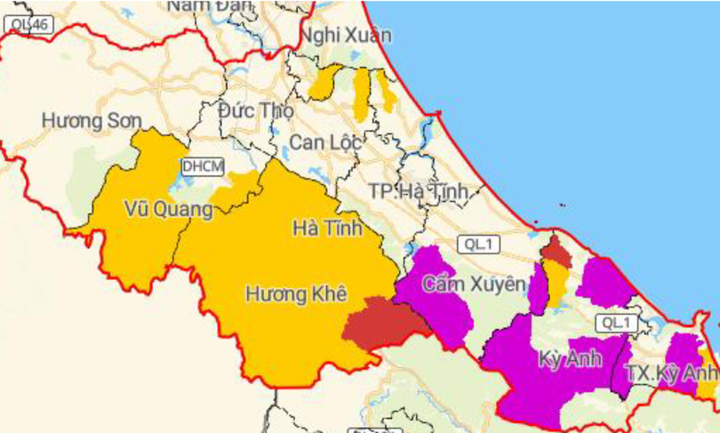 Bản đồ nguy cơ lũ quét, sạt lở đất đá trên các khu vực ở Hà Tĩnh.