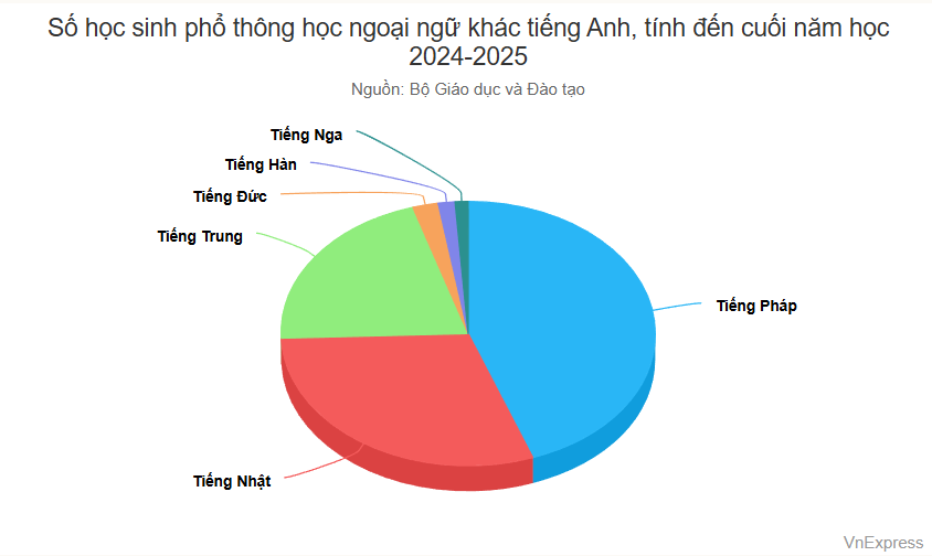 Tiếng Anh được dạy ở tất cả tỉnh, thành. Với 6 ngoại ngữ còn lại, khoảng 40/63 địa phương cũ triển khai. Tiếng Pháp đông nhất với hơn 30.700 học sinh, rồi đến tiếng Nhật Bản (hơn 20.800), tiếng Trung (gần 14.400)... Số này bao gồm cả những em học theo hệ 7 năm hoặc 10 năm, hoặc học như Ngoại ngữ 2 hay tham gia các chương trình thí điểm.